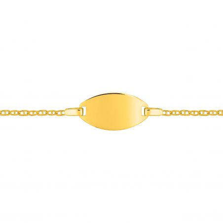 This child's number is a 9-carat gold bracelet with a small elongated plaque that can be engraved with a first name and a date. This bracelet is adjustable in length.