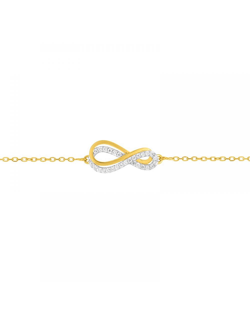 This 9 carat gold bracelet is a bracelet made up of 2 infinite, one of which is stuck with zirconium oxide stones. This bracelet is adjustable in length from 16.5cm to 18cm.
