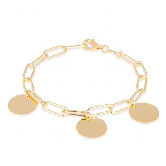 This 925 silver bracelet for women is a golden bracelet with 3 medals measuring 14mm in diameter. Each of the medals can be engraved with a word and a date (at an additional cost), if you wish to engrave the medals, please contact our customer service for a quote.