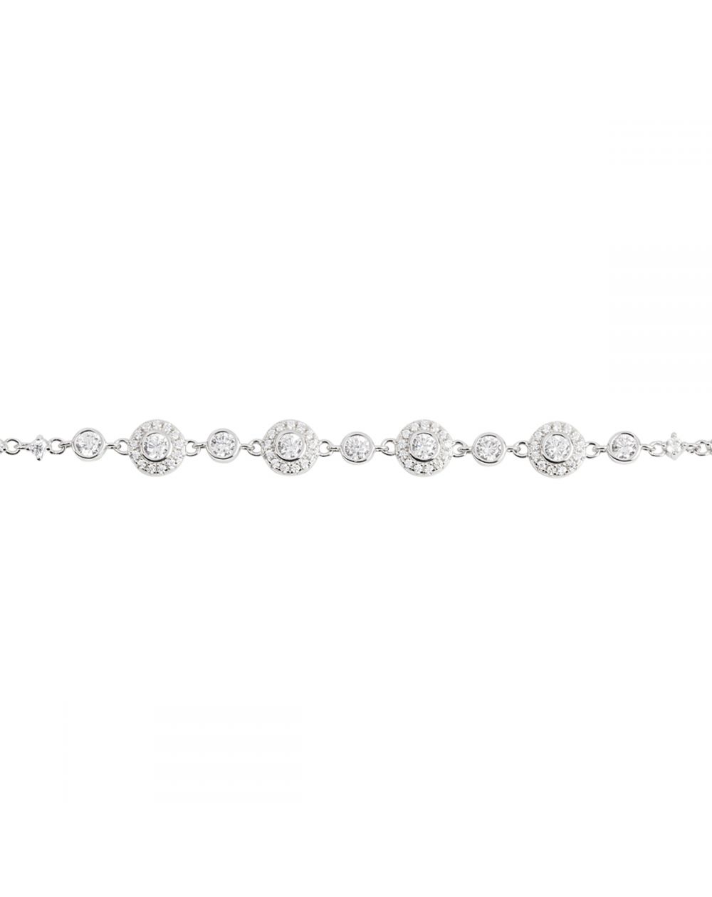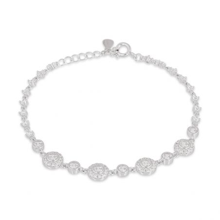 This bracelet is a silver bracelet with different gemstone discs. Zirconium oxide stones run throughout it.