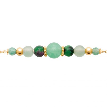 Discover this magnificent 18-carat gold-plated women's bracelet adorned with green aventurine beads. This elegant and refined piece of jewelry is perfect for adding a touch of sophistication to your wrist. Aventurine, a stone known for its soothing and lucky virtues, is enhanced by small golden pearls, creating a harmonious and dazzling contrast.