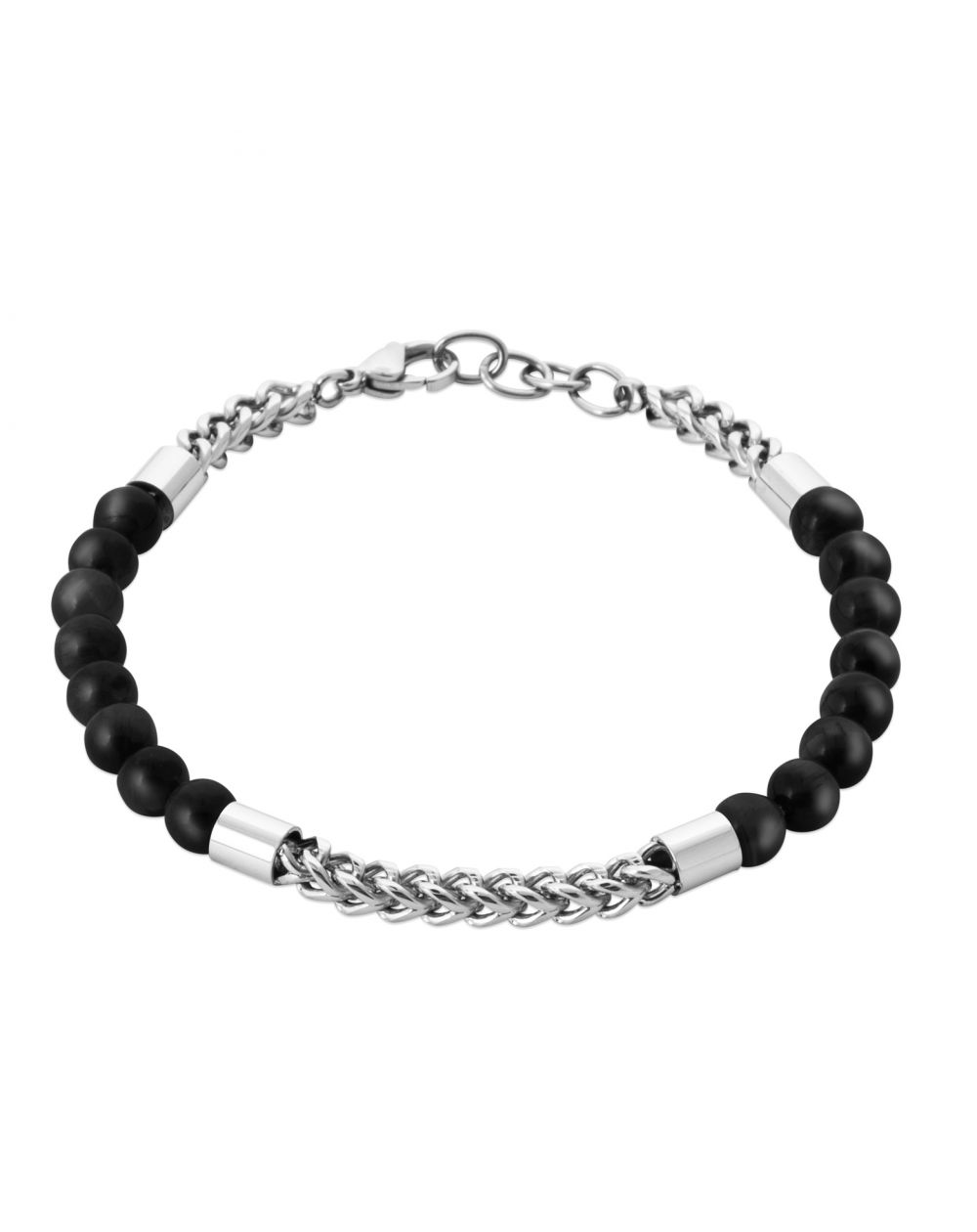 Sleek and powerful, the Noctis bracelet combines polished stainless steel with the matte depth of black agate, creating an elegant and masculine contrast. Finely polished natural black pearls frame a subtly shimmering silver mesh for a bold, contemporary look.