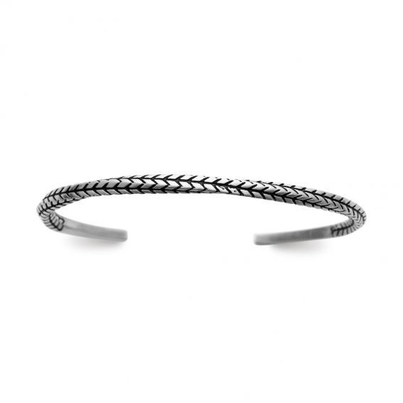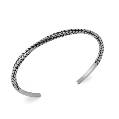 The contrast between the metal finish and the black engraved details adds character without excess, making this men's bangle a versatile piece of jewelry, equally at home with a casual outfit as with a more formal style.