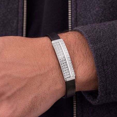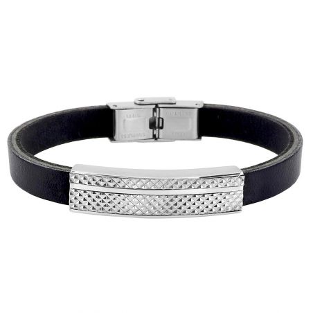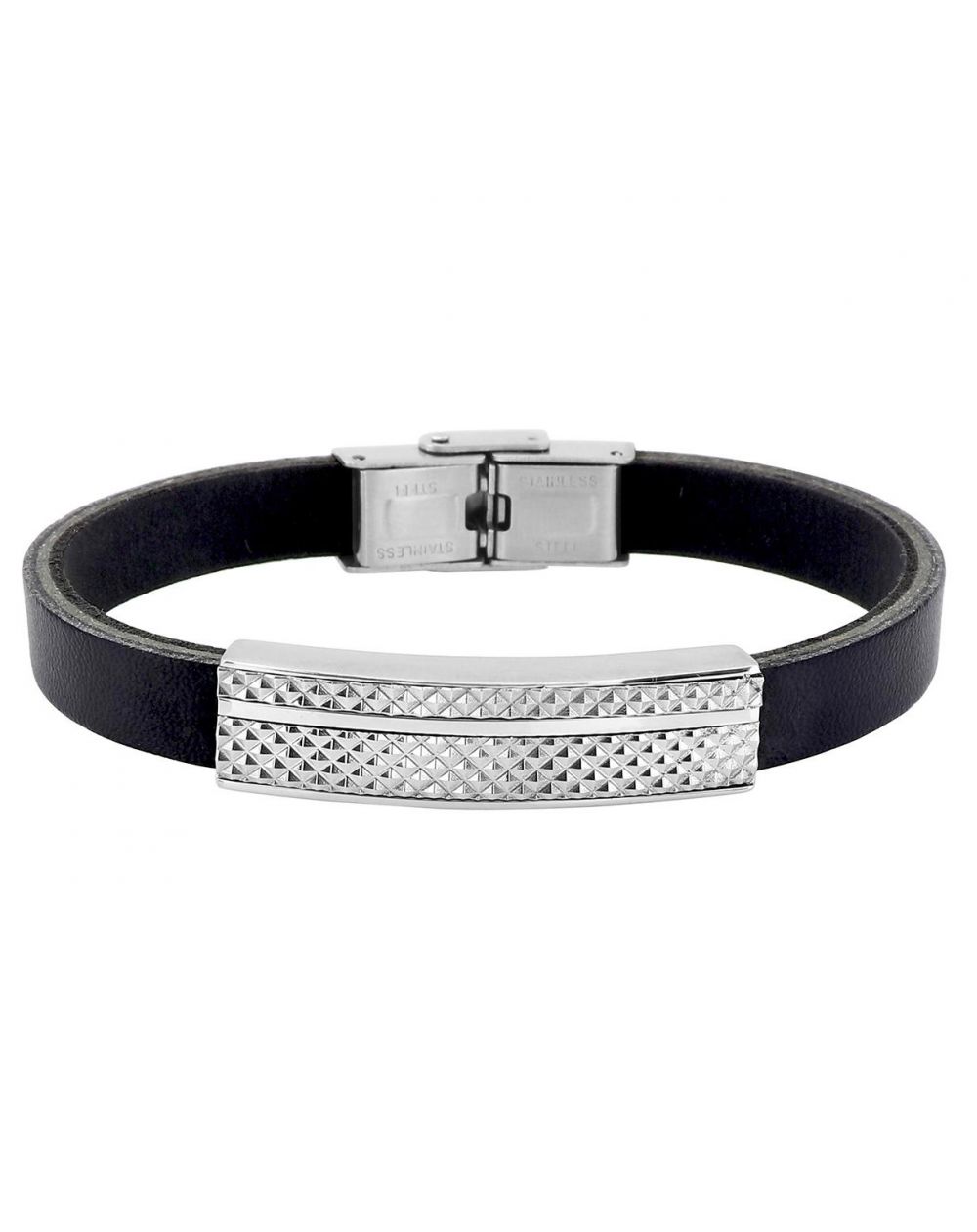 Bijou argent/plaqué or Men's stainless steel and black leather bracelet – 10mm textured plate, 20cm length