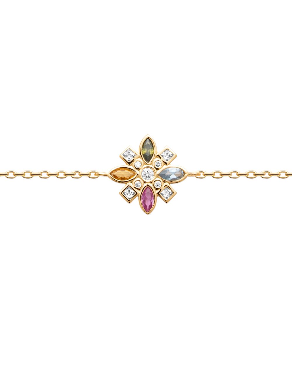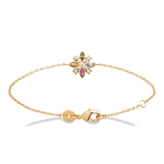 Be captivated by the charm of the Stella Multicolore gold-plated bracelet , a delicate and luminous piece that adds a subtle touch of color to your wrist. Its central floral star motif , adorned with delicately tinted stones, catches the light and elegantly draws the eye.
