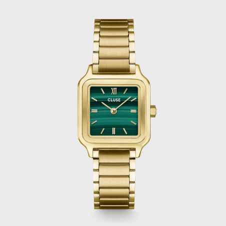 Elegant and refined, the Cluse Gracieuse Petite watch captivates with its timeless design and unique mineral touch. Its 24mm square case in gold-tone stainless steel frames a stunning green dial with a malachite effect , adding depth and character to your wrist.