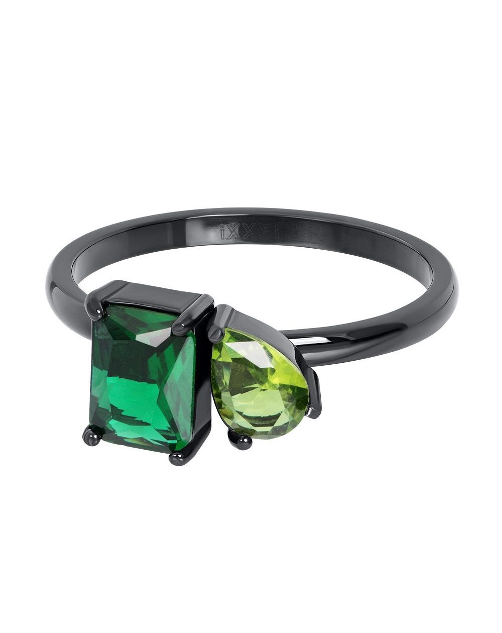 Sleek and bold, this blackened metal ring stands out with its modern design and vibrant green stones. The ring features two finely faceted stones: one rectangular and one teardrop-shaped, each catching the light in a captivating way. The contrast between the dark metal and the vibrancy of the stones creates a powerful visual effect, adding a contemporary and sophisticated touch to this piece. Perfect for those looking for a piece of jewelry that combines modernity and refinement