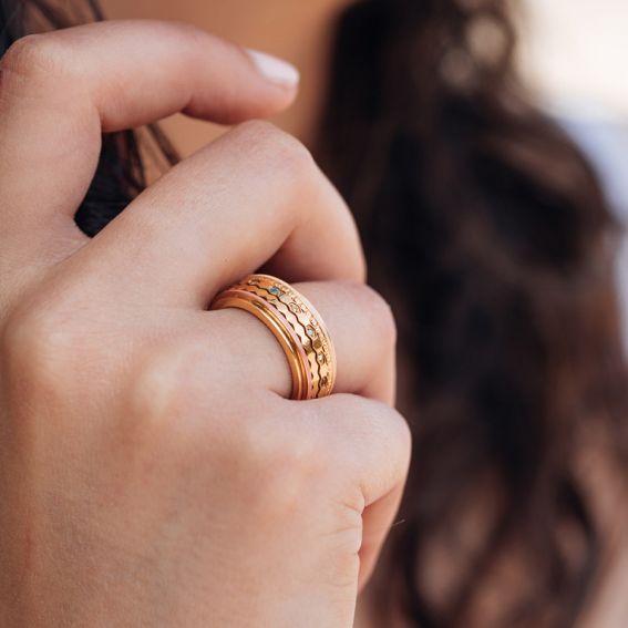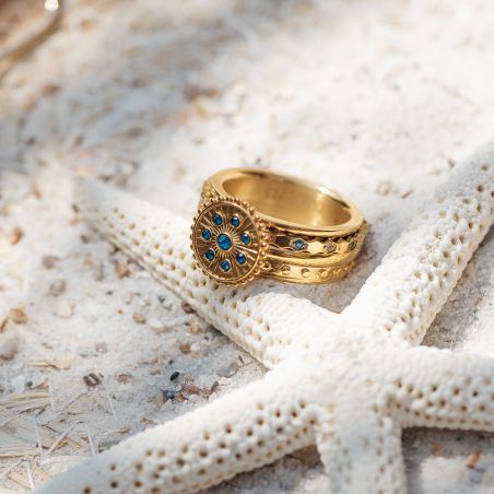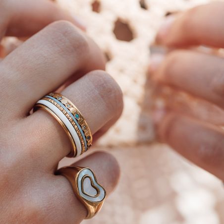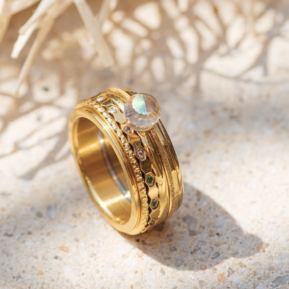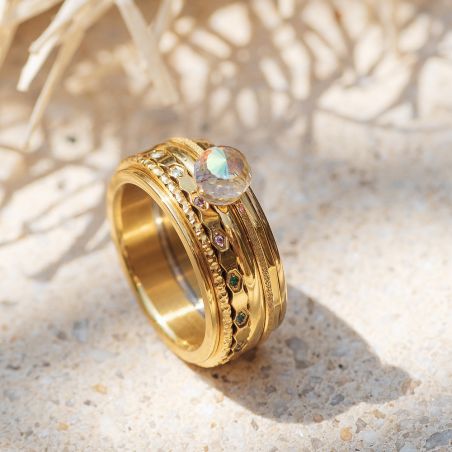 The iXXXi "Marisol Color" Filler Ring is a smooth, 2mm wide ring made of stainless steel with a fine gold-plated finish. It features a refined diamond pattern and is adorned with small, multi-colored zircons that add a playful, colorful touch.