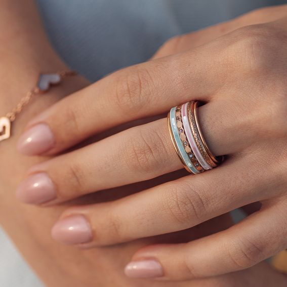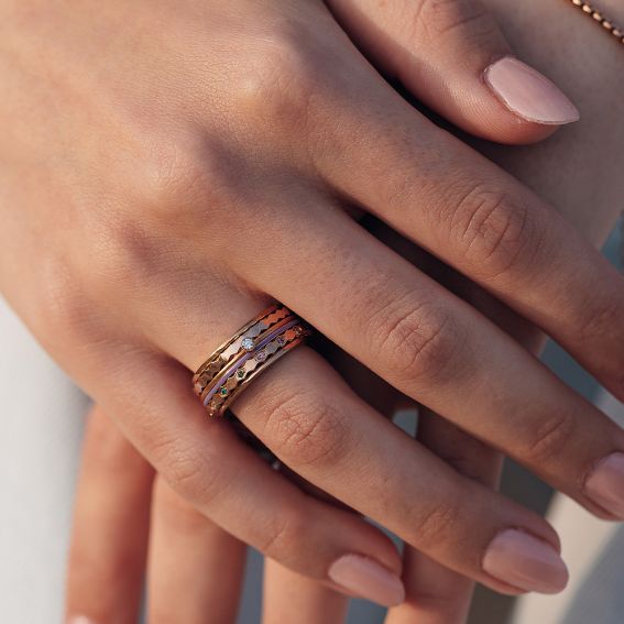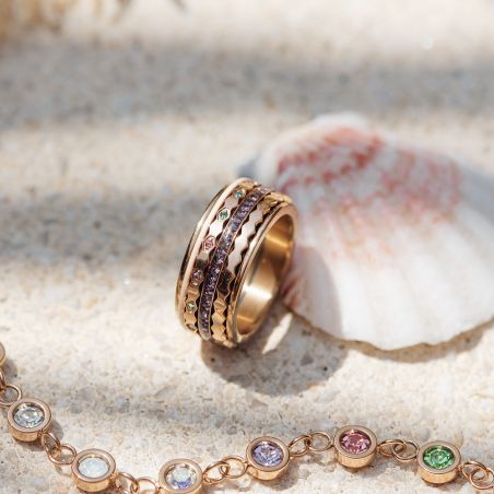 The Marisol Color Filler Ring is a smooth, 2mm wide ring made of stainless steel with a rose gold plating. It features a refined diamond pattern and is adorned with small multi-colored zircons that add a playful and colorful touch.