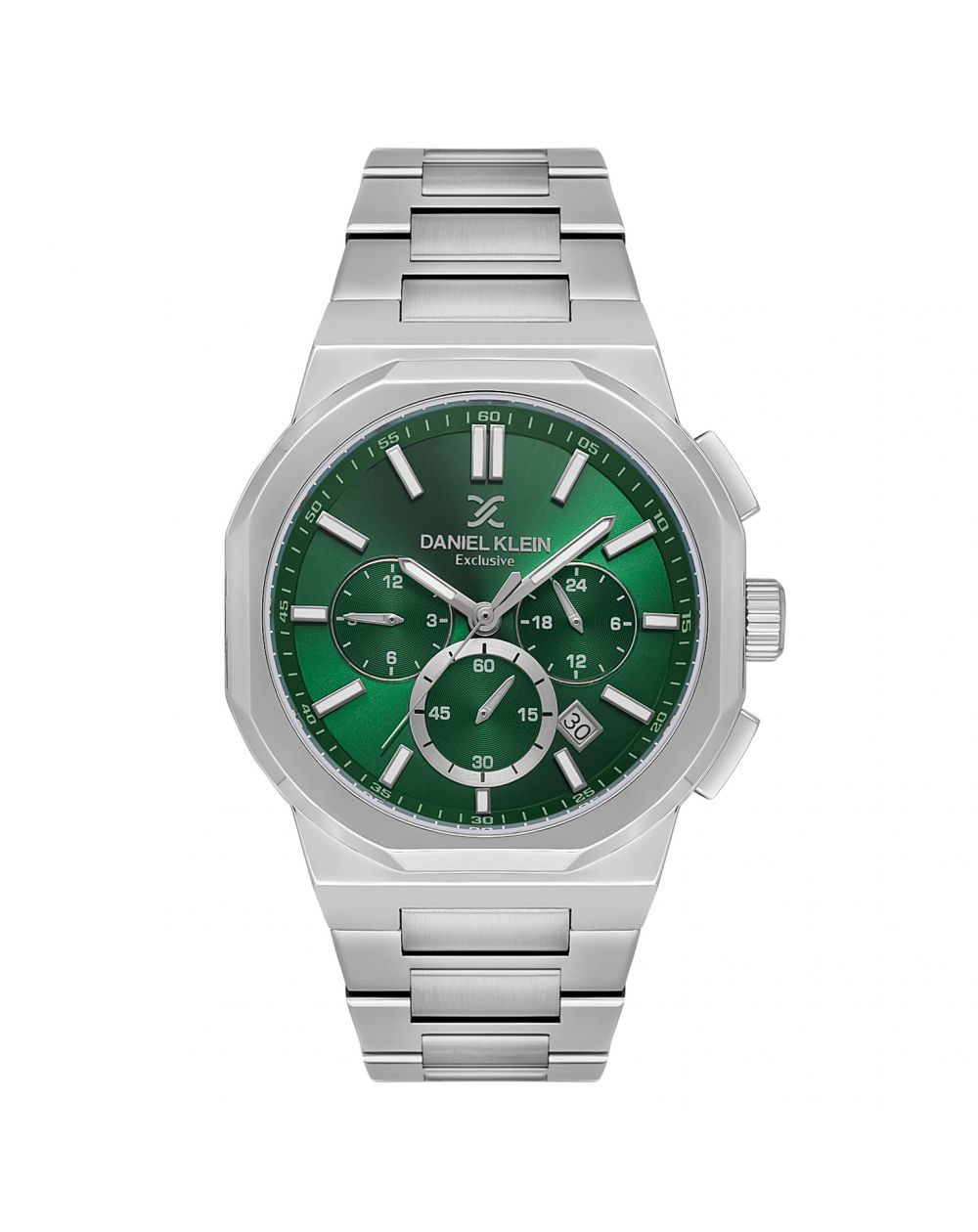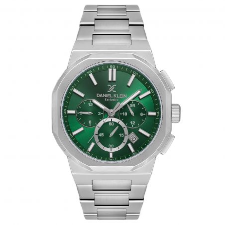Daniel Klein DK.1.13812-4 multifunction men's watch , combining elegance and modernity with a stainless steel case and bracelet. Its vibrant emerald green dial, decorated with silver details, brings a sophisticated and unique touch. Equipped with practical features such as the chronograph and date display, this watch is perfect for active and stylish men.