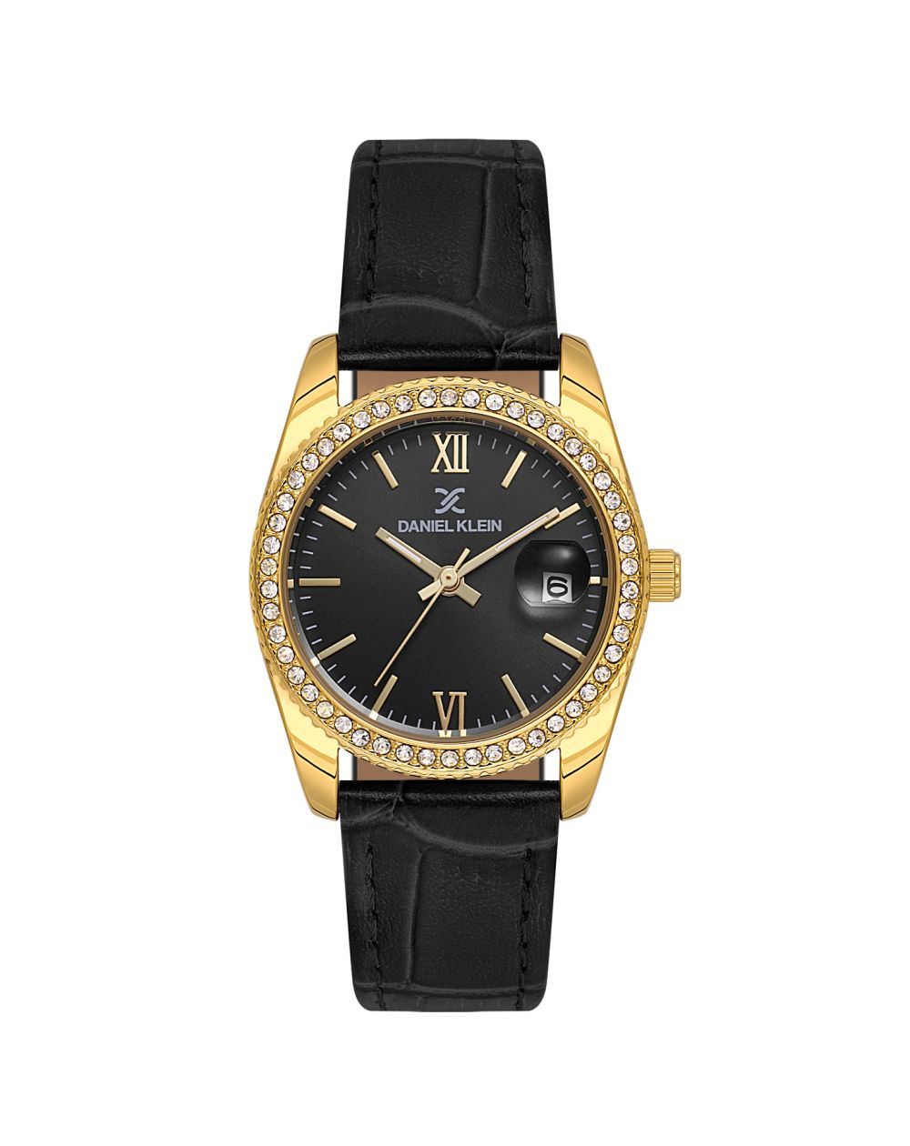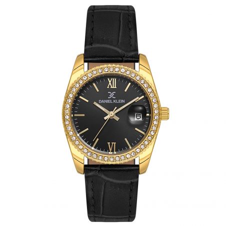 The Daniel Klein DK.1.14030-2 is a men's watch that combines prestige and modernity. Its gold case, enhanced by a crystal-encrusted bezel, gives it a luxurious look, ideal for those who like to stand out with elegance. Its deep black dial, punctuated with gold hour markers and refined Roman numerals, offers clear legibility and a timeless style.