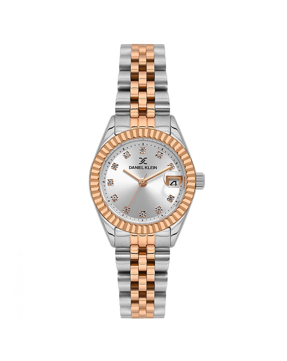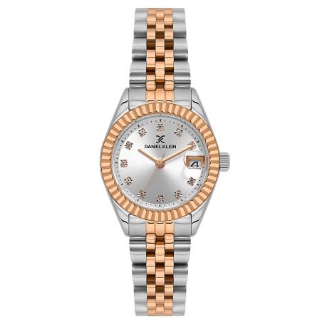 The Daniel Klein DK.1.13969-8 watch captivates with its refined and feminine allure. Its 28mm case, enhanced by a textured rose gold bezel, adds a luminous and sophisticated touch to your wrist. The silver dial, adorned with sparkling gem-like hour markers, creates a delicate play of light with every movement.