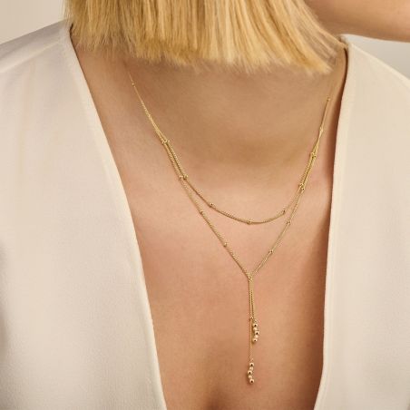 A double beaded chain, adorned with delicate hanging pendants set with four diamonds (4x), inspired by the gentleness of a light breeze and waves gently crashing on the shore. Perfect for diving into a sparkling world and enhancing plunging necklines.