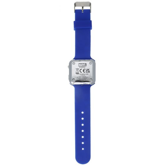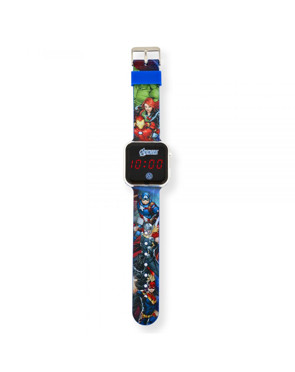 This Marvel Avengers digital watch features a dynamic design with a strap featuring iconic superheroes like Iron Man and Captain America. Its LED screen displays the time in bright red on a modern black background. Perfect for young fans of the Avengers universe, it combines heroic style and practicality for a look inspired by Earth's greatest defenders.