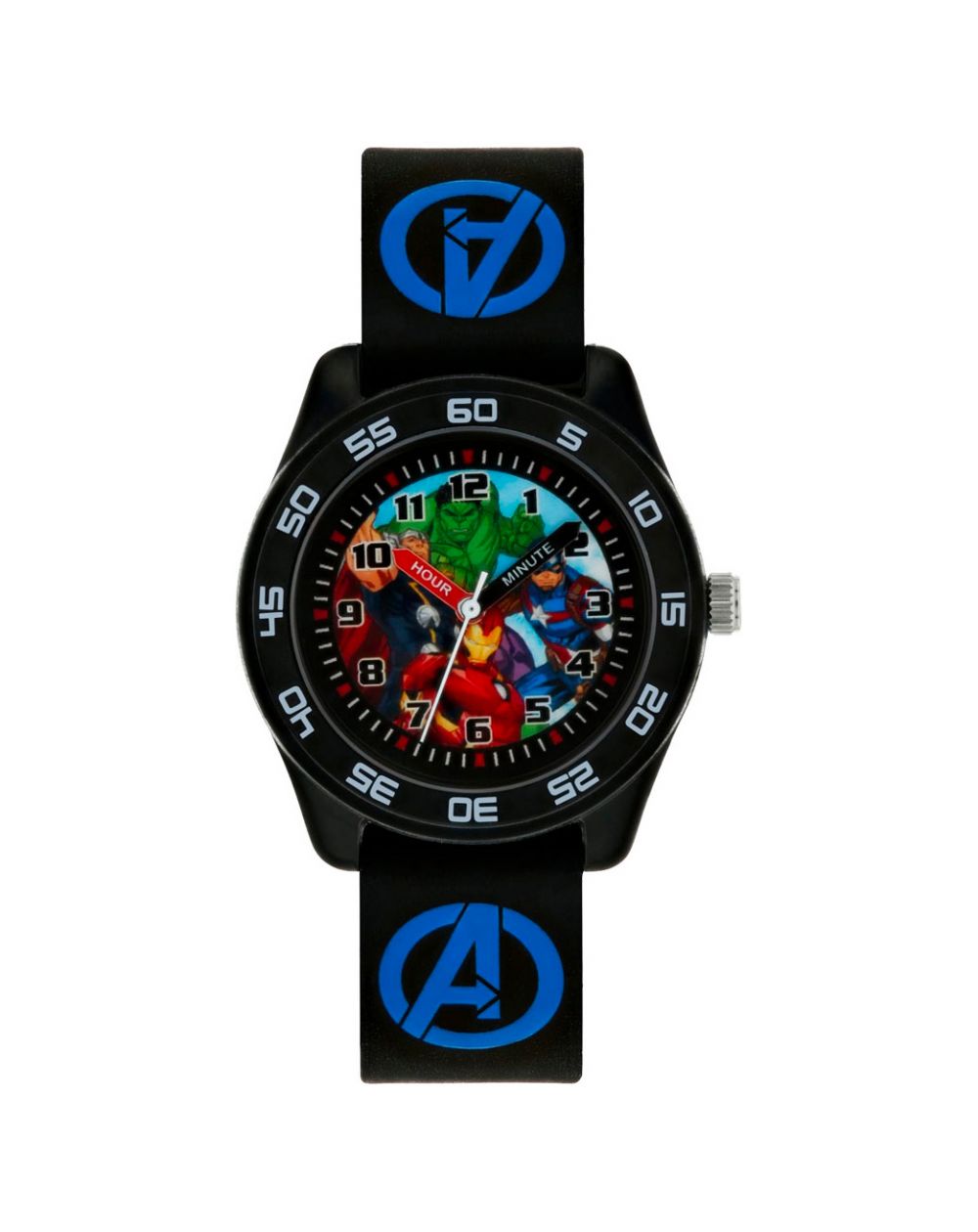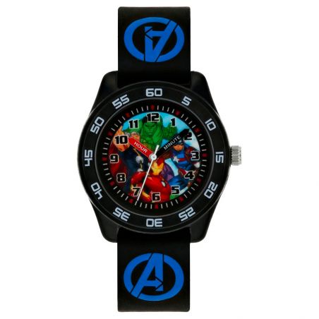 Show off the power of Marvel Super Heroes with this officially licensed black AVG9007 Avengers watch . Its dial features iconic heroes—Iron Man, Hulk, Captain America, and Thor—in a vibrant, colorful design. The graduated outline and hour and minute hands make it easy to tell the time, ideal for children learning.
