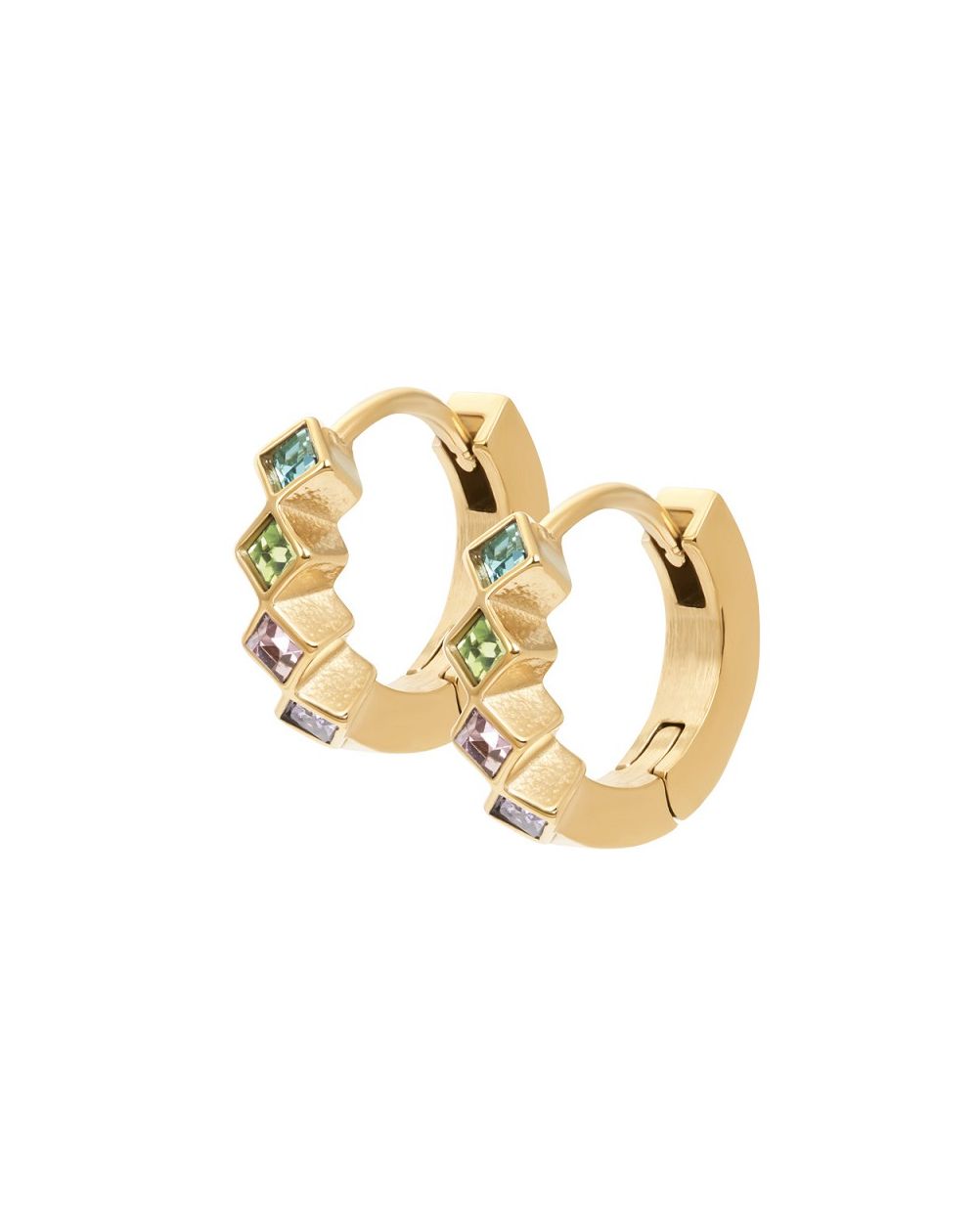 These iXXXi gold-tone stainless steel hoop earrings feature an original geometric faceted design, adorned with colorful crystals set in pavé. Their modern, dazzling silhouette brings a sophisticated and bold touch, perfect for enhancing any look with contemporary elegance.