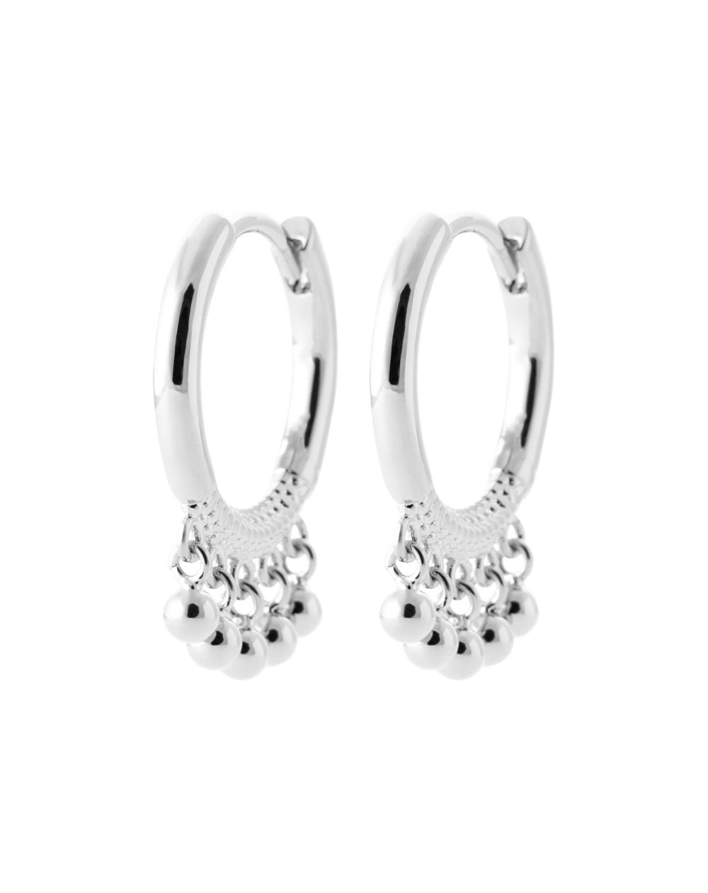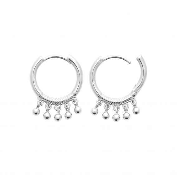 These silver hoop earrings are decorated with small hanging pearls.