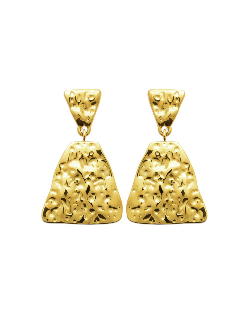 These gold-plated steel earrings feature a hammered, organic texture that catches the light with brilliance. Their asymmetrical, sculptural shape gives them a bold, contemporary look, ideal for enhancing an outfit with character and originality.