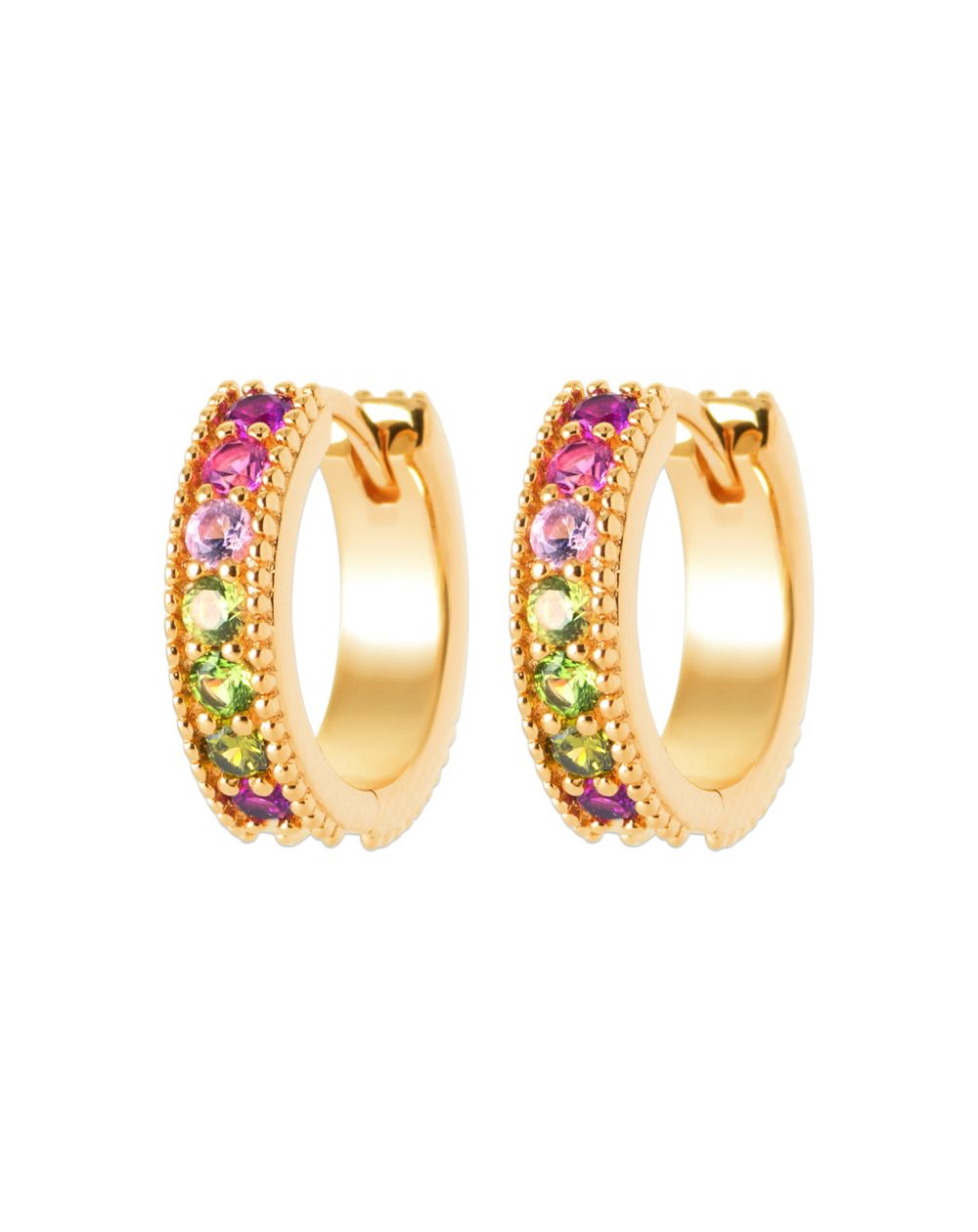 Radiant and sophisticated, the Rainbow Luxe hoop earrings instantly brighten your look. Made of 18-karat gold plating with a 10-year guarantee on the plating, they stand out with their superb row of multicolored stones: pink, purple, and green, for a joyful and ultra-trendy effect.