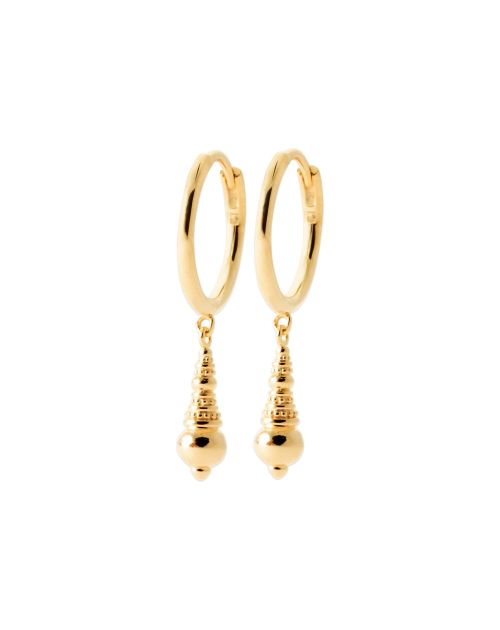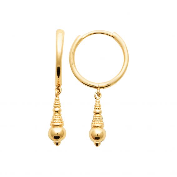 The Calysta hoop earrings combine the purity of a smooth ring with a delicately crafted pendant composed of subtly stacked golden volumes. Their refined design adds movement and understated elegance, ideal for illuminating the face without being over the top.