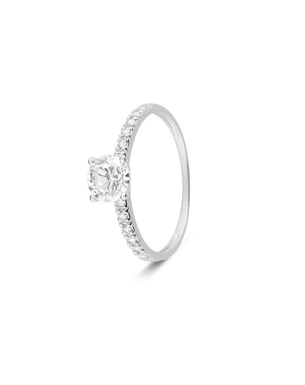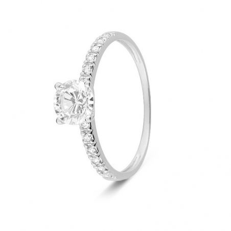 This solitaire with a large stone is a 9-carat white gold solitaire whose ring body is set with zirconium oxide stones.