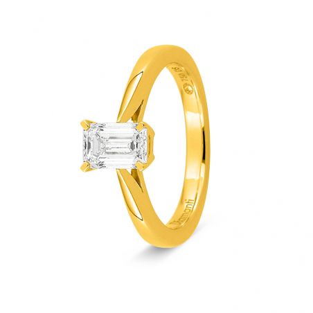 Graphic and undeniably elegant, this 18-karat yellow gold (Au 750) solitaire ring showcases a lab-grown emerald-cut diamond weighing at least 0.70 carats . Its rectangular cut with beveled corners is distinguished by clean lines and sophisticated brilliance, highly prized for its chic and contemporary style.