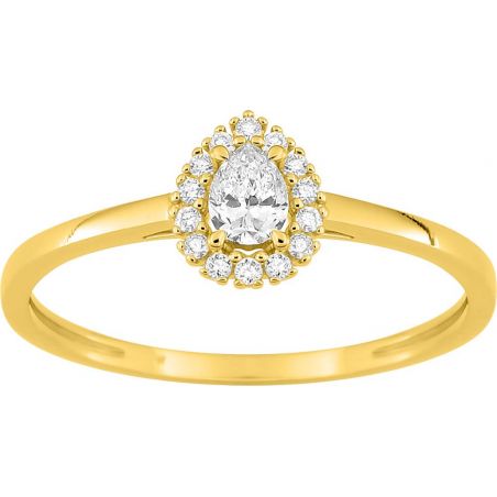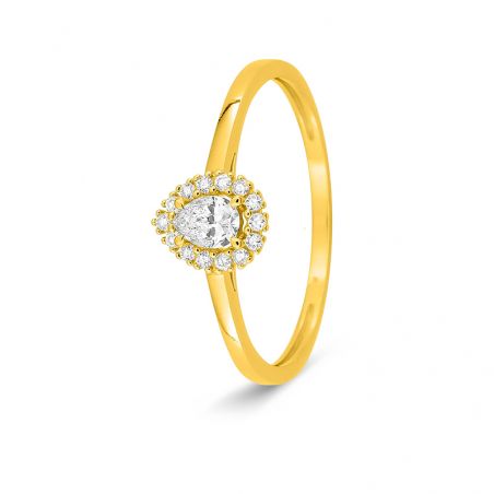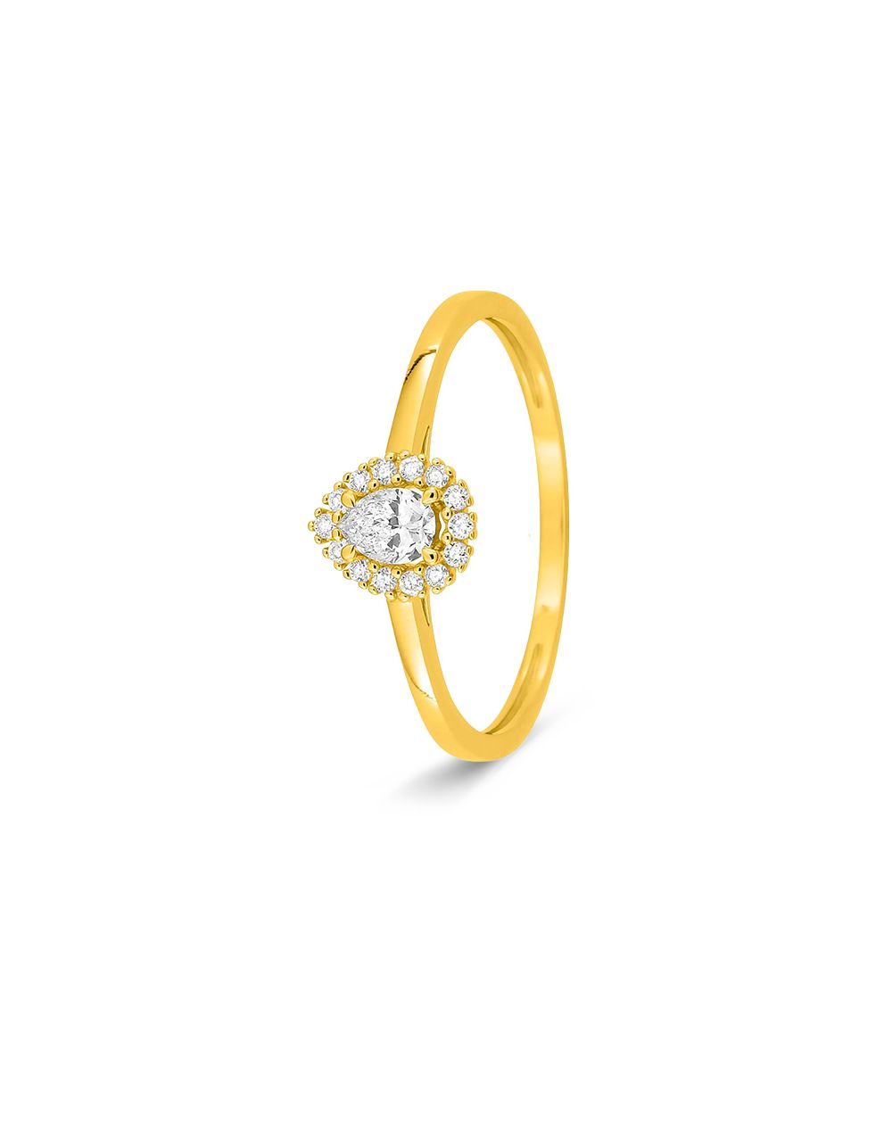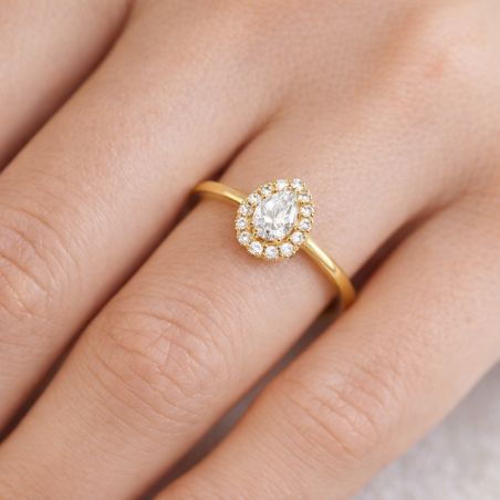 Delicate and decidedly feminine, this 9-karat (375) yellow gold ring showcases a 0.15-carat pear-shaped lab-grown diamond , surrounded by a refined halo of diamonds totaling 0.22 carats . Its teardrop shape elongates the finger and lends a soft, timeless elegance.