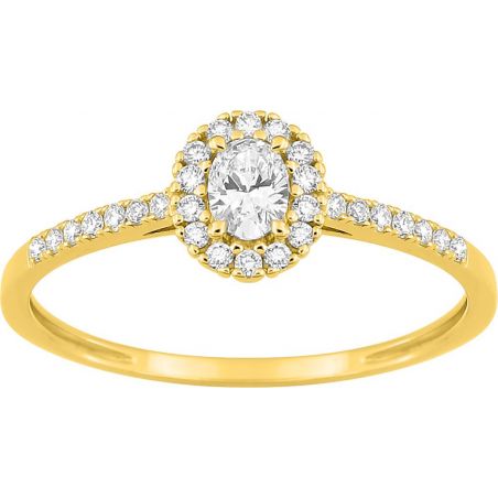 Elegant and luminous, this 9-karat (375) yellow gold ring showcases a 0.16-carat oval-cut lab-grown diamond , delicately surrounded by smaller diamonds totaling 0.30 carats . The halo design visually amplifies the central stone and diffuses light with finesse, for a refined and feminine effect.