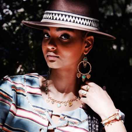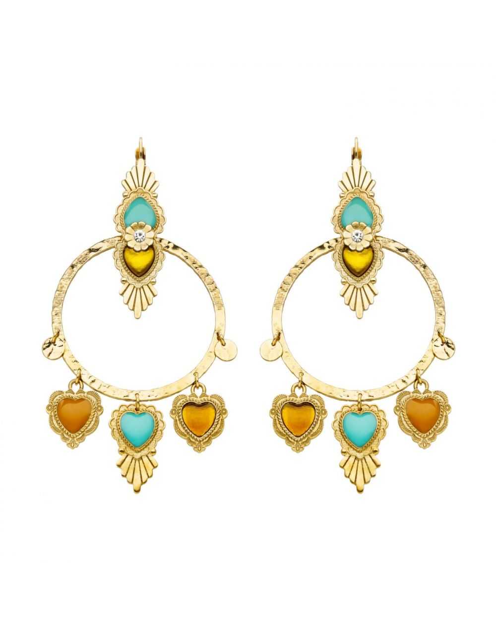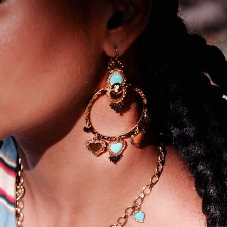 These Hipanema brand earrings are creoles for pierced ears gilded with fine gold, equipped with a sleeper attachment. The head of the earring is composed of two inverted hammered hearts, worked in a baroque style on a creole ring decorated with charm pendants: small hearts and sequins of Latin American inspiration. We love this association of colors with occurrences of green resins with turquoise, amber or coffee effect in a New Mexico spirit.