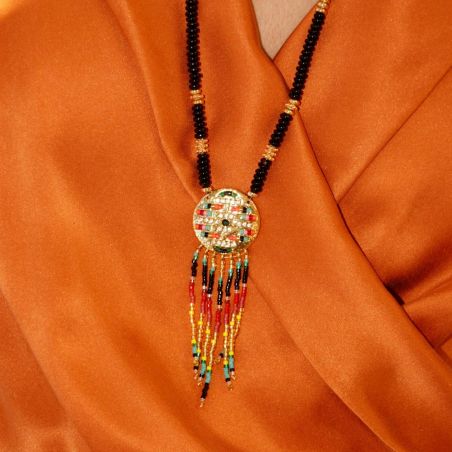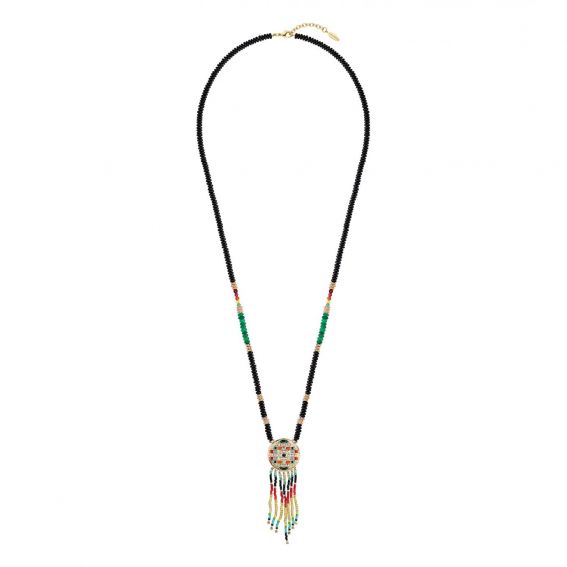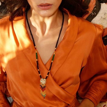 This Hipanema brand necklace is a long necklace in brass gilded with fine 18 carat gold, in semi-precious black agate, green aventurine and tinted quartz beads, interspersed with golden washers. In the center, an ornate golden medallion, on which we find multicolored Miyuki pearls and rhinestones.