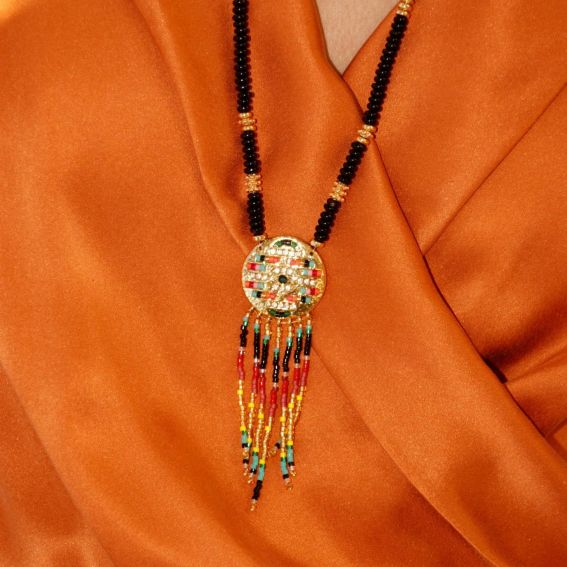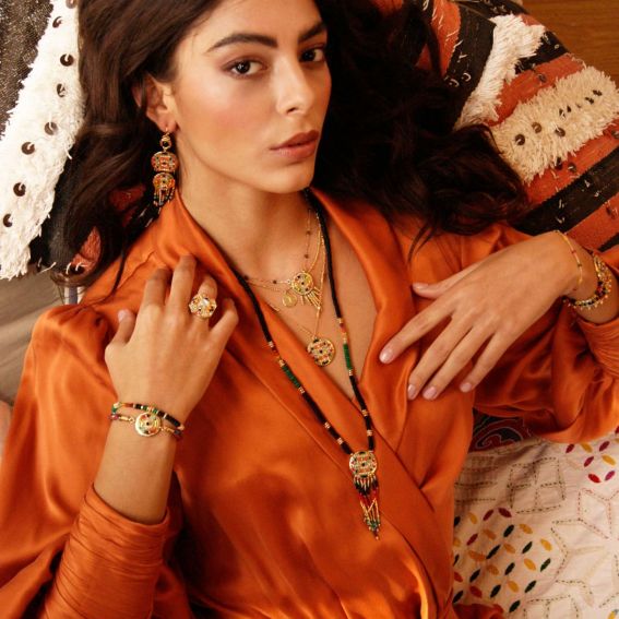 We love the cascade of Japanese pearls, in a gradation of black, neon orange, gold, yellow, turquoise, pale pink for an explosive color harmony. The shaman necklace made with love by Hipanema, ideal for a pretty neckline.