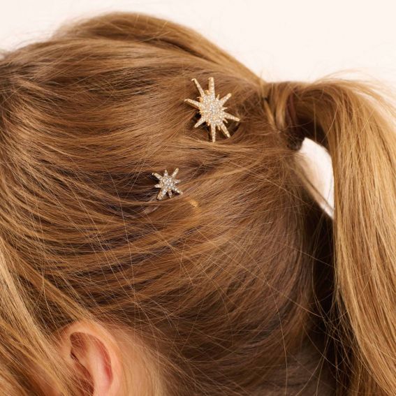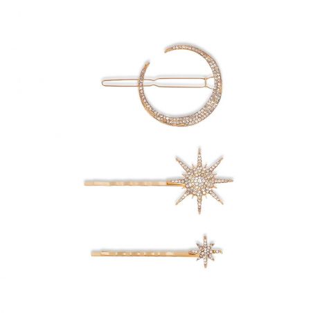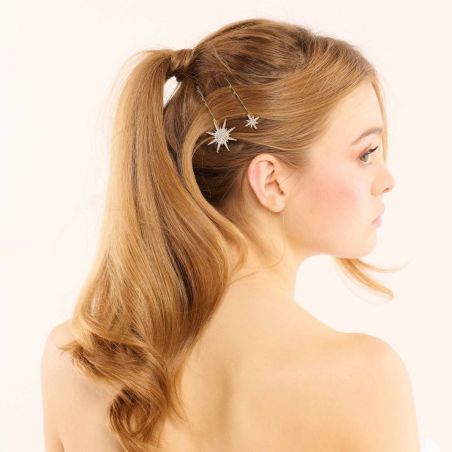The Anaaya barrette set, in fine gold-plated copper, stands out with its sparkling rhinestone patterns, merging dark elegance and vibrant modernity. Easy to clip, they enhance a structured ponytail, enhance a sophisticated half-updo or brighten up free, airy hair.