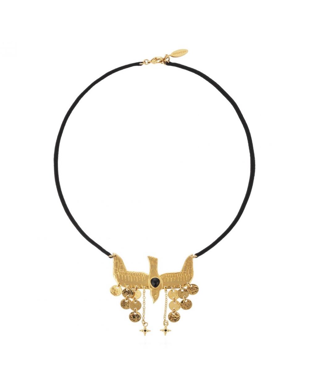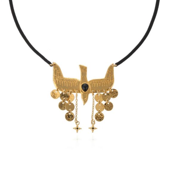 Suspended from a glazed cotton cord, the golden dove of the NIPOA necklace spreads its wings in a delicate flight. Two cascades of golden sequins enhance this handcrafted piece with a luminous and balanced charm.
