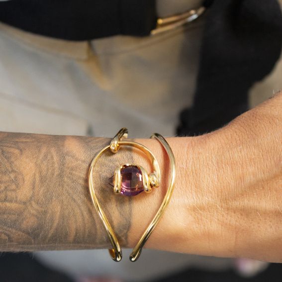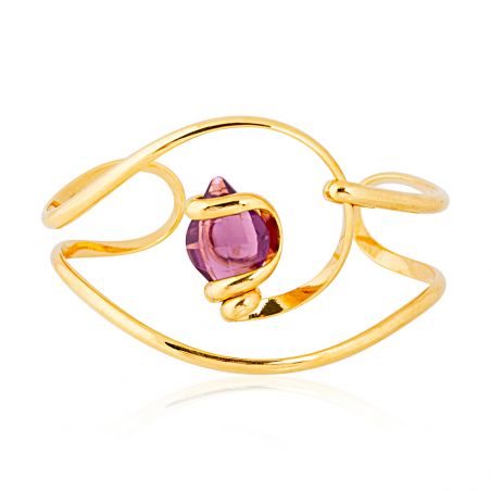 The Andrea Marazzini Lemon Amethyst BR6 Gold Bracelet is a delicate and luxurious creation, distinguished by its unique and refined design. This gold bracelet features a drop-shaped Swarovski crystal, in a captivating shade of lemon amethyst, a soft purple with pinkish undertones. The gemstone is meticulously set in a fluid and organic gold structure, which artistically envelops the stone.