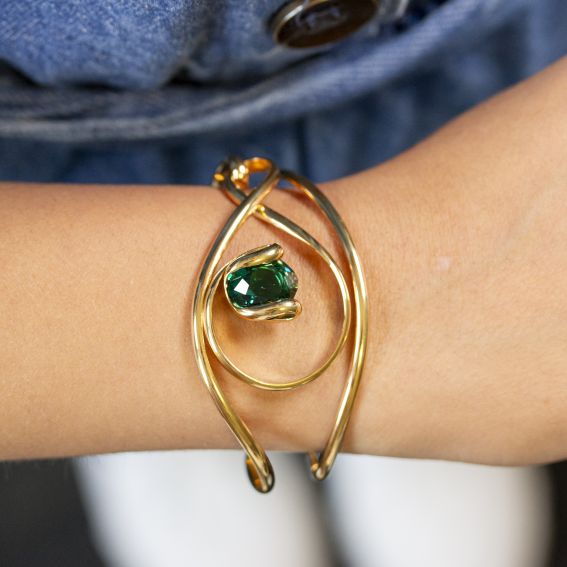 This gold-tone bracelet is an elegant piece with a finely crafted gold-tone metal structure, forming soft, intertwining curves that frame the central crystal. The shape of the design seems to be inspired by an organic pattern, almost reminiscent of a stylized eye, with the emerald-colored crystal capturing all the attention at the center. The Swarovski crystal is cut to beautifully reflect light, adding a touch of depth and sparkle to this piece.