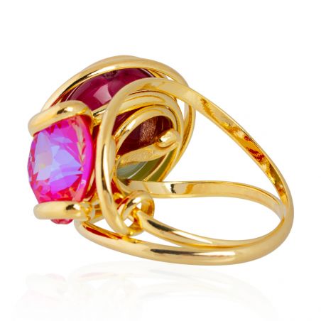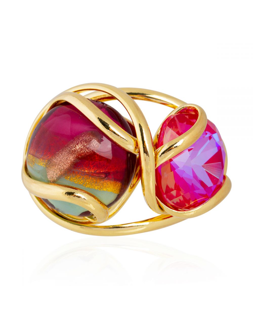 This sumptuous ring from the Andrea Marazzini collection embodies a harmonious marriage of modernity and art. The Venice F4 gold double model stands out with its bold and sculptural design. The two central stones, carefully hand-crafted, display vibrant and luminous hues: a captivating mix of flamboyant red, sparkling golden touches, and multi-colored sparkles. These elements are enhanced by a structure in fine gold-plated metal, which delicately envelops the stones in dynamic and elegant curves.
