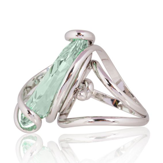 Let your hand shine with a refreshing glow with the Andrea Marazzini New Drop Peridot ring . Entirely handcrafted in Italy, this contemporary ring in shiny silver-plated metal showcases a peridot-colored Swarovski® crystal , with subtle, luminous sea green reflections. Its signature design, all elegant spirals and dynamic lines, evokes the fluid movement of water, delicately enveloping the precious stone.