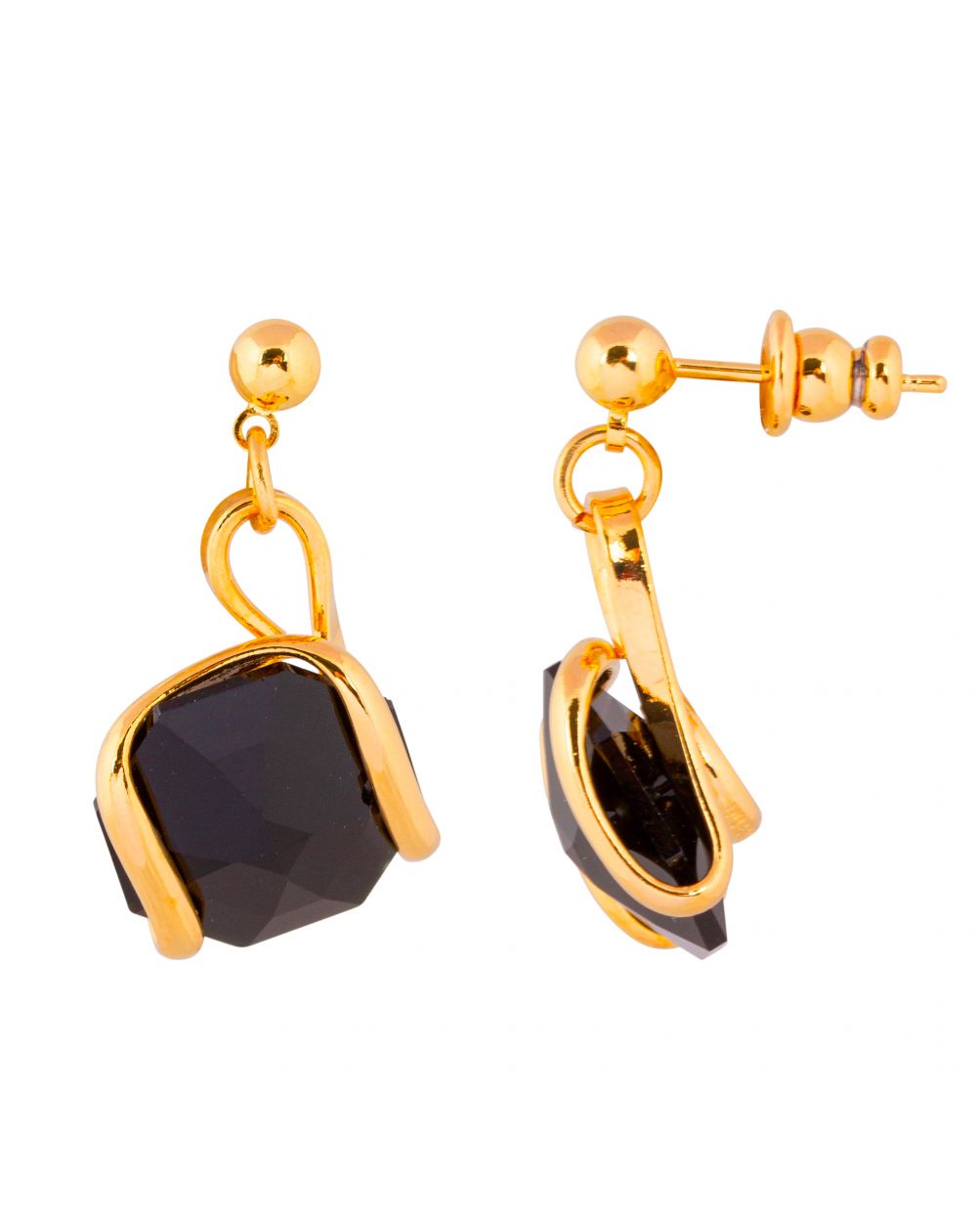 Their 24-carat gold-plated metal frame embraces a sumptuous deep black Swarovski® crystal , cut in a refined octagonal shape. The brilliance of the crystal contrasts beautifully with the warmth of the gold, creating a piece of jewelry that is chic, modern, and timeless .