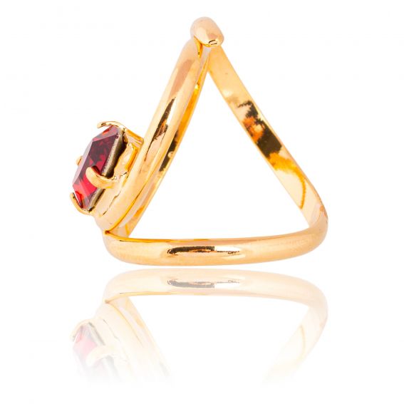 The perfect balance between contemporary geometry and the fiery femininity of deep red gives this ring a magnetic appeal. The flowing curves of the gold setting enhance the brilliance of the crystal, creating a piece that is as elegant as it is timeless.