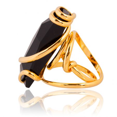 The Andrea Marazzini Monolite Black ring captivates with its architectural design and minimalist elegance. It showcases an official black Swarovski crystal , cut into a faceted monolith shape, whose deep intensity contrasts with the brilliance of the gold-tone metal.