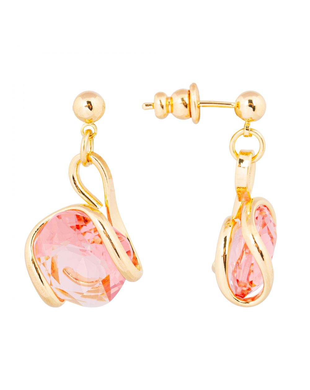 The gold-plated setting, a signature of the Italian designer, delicately embraces the crystal in a fluid, organic movement. Suspended from a discreet clasp, the earrings offer a slight sway that amplifies their brilliance with every gesture.
