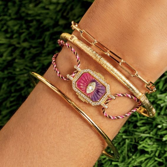 This bracelet from the MyaBay brand is characterized by its distinctive and vibrant design. It features a rectangular pendant with a textured pink background, topped with a central eye encrusted with a crisp white stone, surrounded by small gold crystals. The border of the pendant is also embellished with shiny stones, completing the luxurious look of the jewelry. The bracelet chain is made of pink and gold braided ropes, giving an elegant and slightly bohemian look. A notable detail is the gold clasp engraved with the "MYA BAY" logo, adding a personal and recognizable touch to the design. This bracelet is ideal for adding a pop of color and sophistication to any outfit.