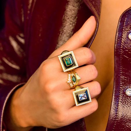 The Blue Stone Tanya Ring by Myabay is an elegant and captivating piece, showcasing a beautiful blue stone at its centre. Crafted in gold plating, this ring is distinguished by its classic and refined design, with a deep green stone that catches the light and immediately draws the eye. Surrounded by small zircons that add a touch of understated sparkle, the centre stone evokes both serenity and luxury.