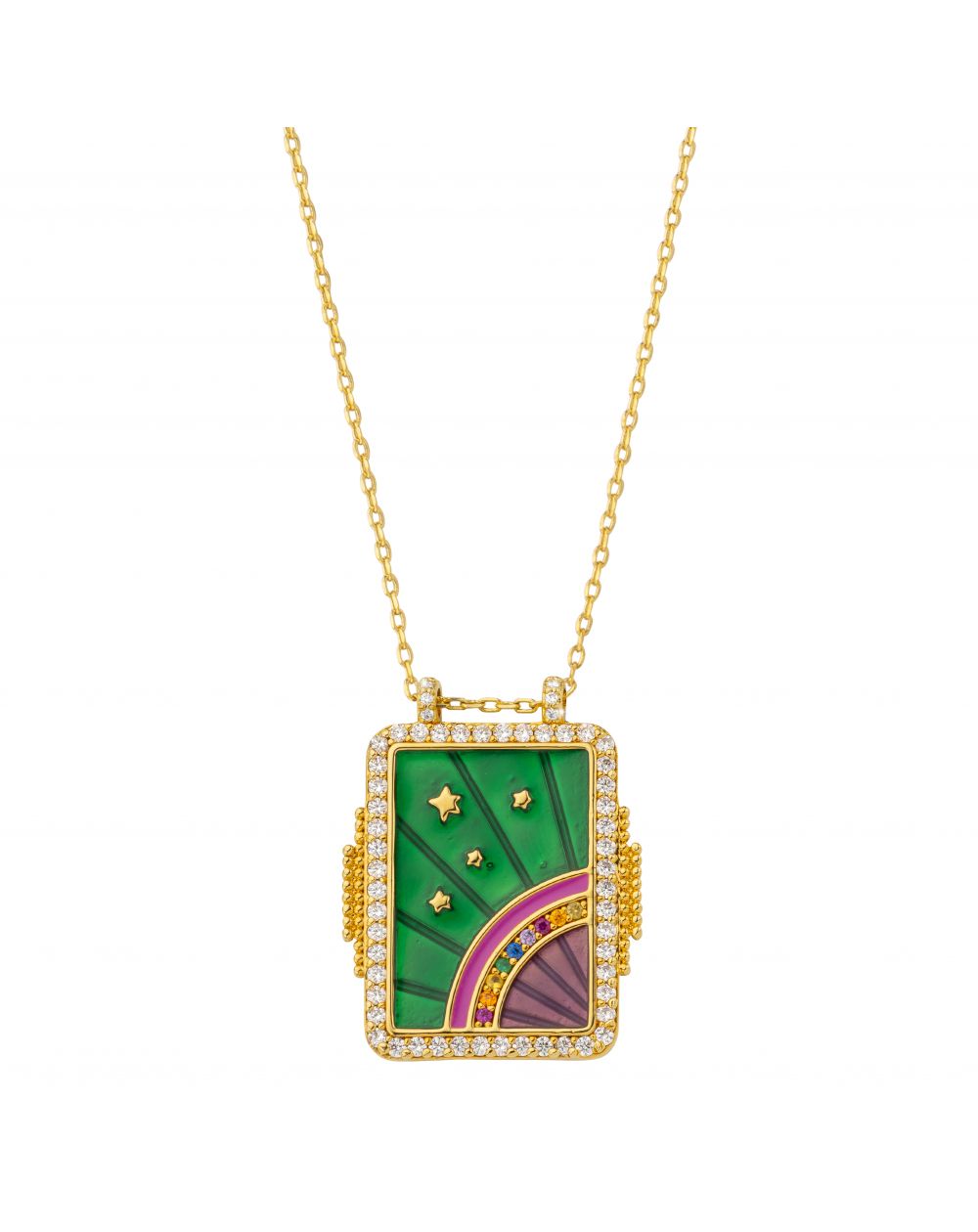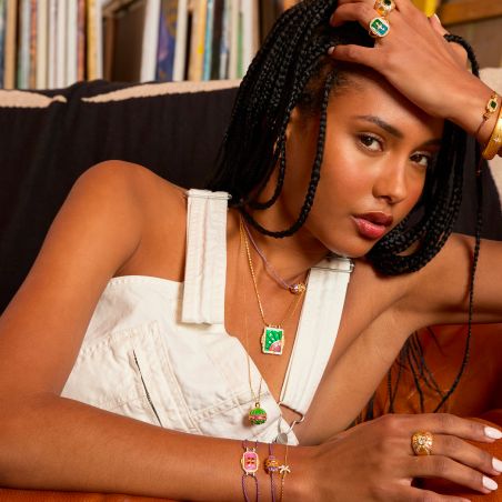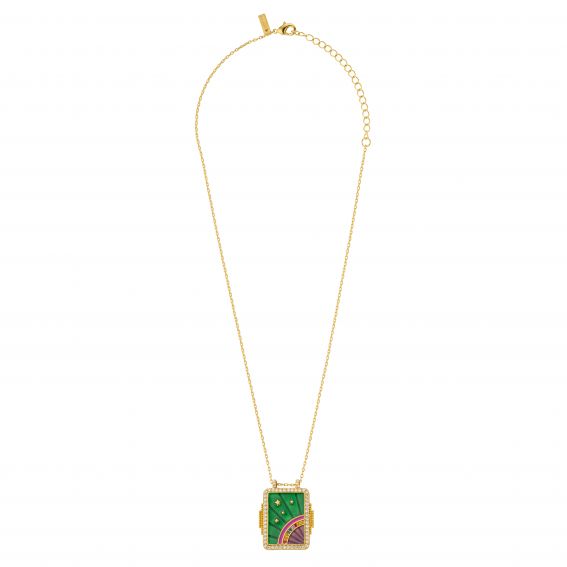 This revisited version of the Bohème necklace, gilded with 24 carat fine gold, features a modern square design in brushed gold, enhanced by semi-precious stones and a rainbow of vibrant enamel.