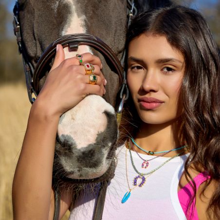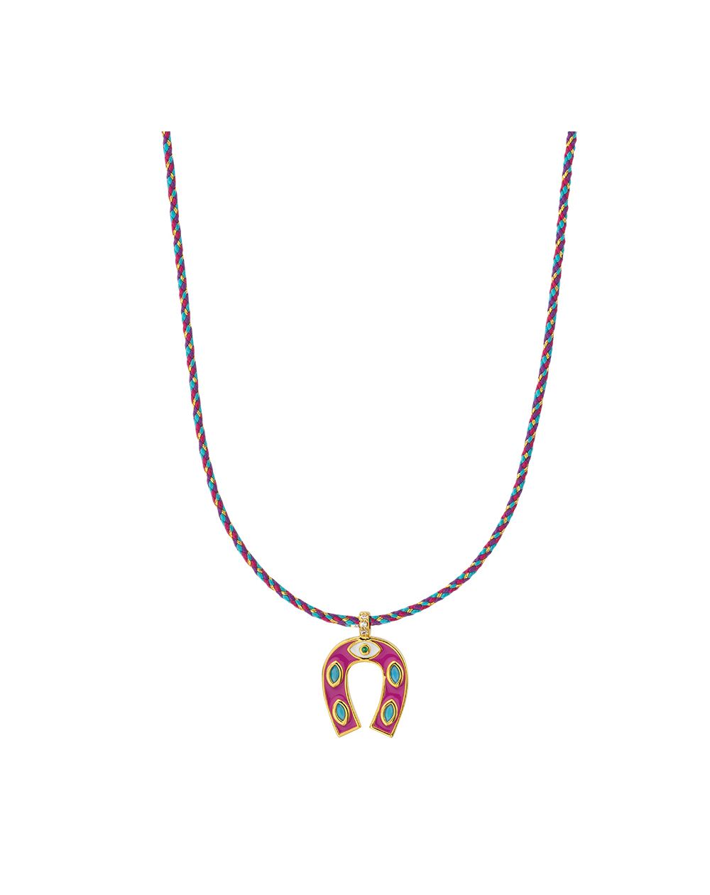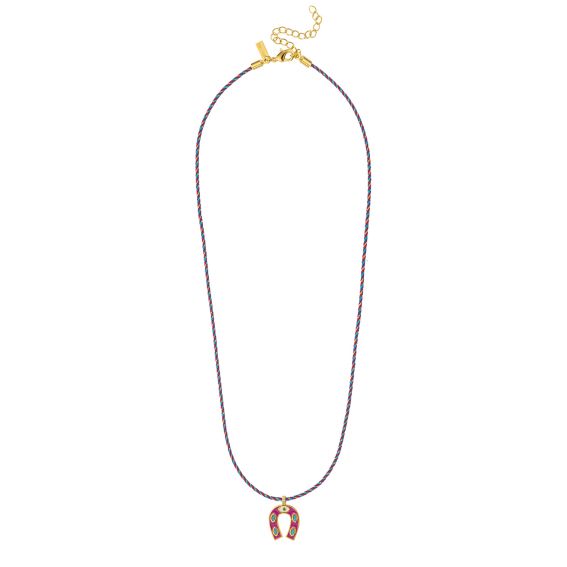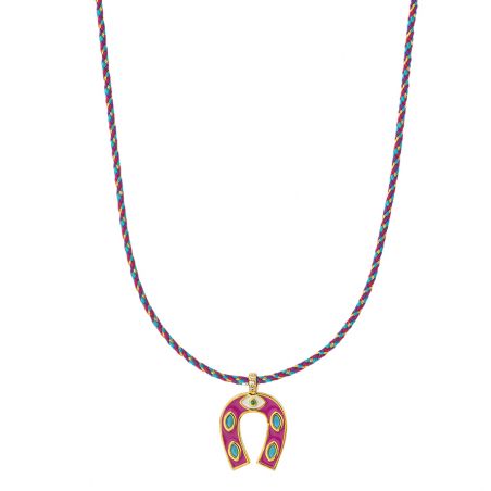 The FUCHSIA MINI HORSESHOE necklace by MYA—BAY is an invitation to color and good humor. Gilded with 24-karat recycled fine gold, it reveals a horseshoe pendant adorned with vibrant fuchsia enamel, a symbol of luck and optimism.