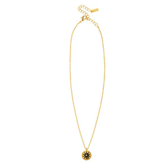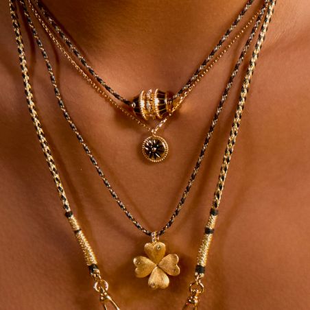 Delicate and refined, the Black Flower necklace by Mya Bay is a charming piece with a bohemian chic style. Its fine chain, gilded with fine 24-carat gold, highlights a round pendant adorned with a stylized black flower, framed with golden beaded details that enhance its radiance.
