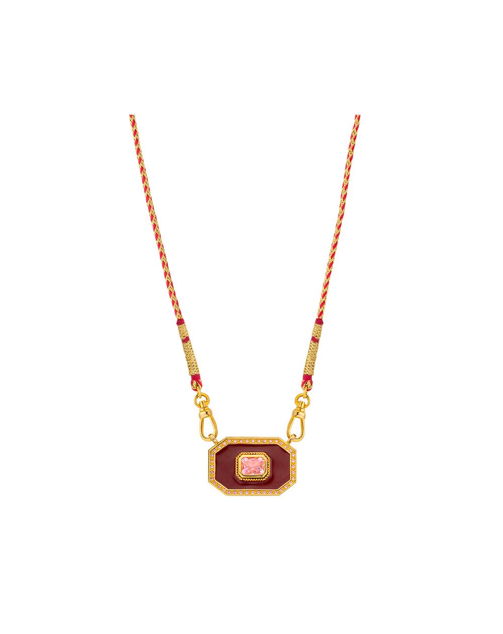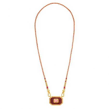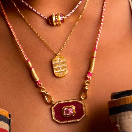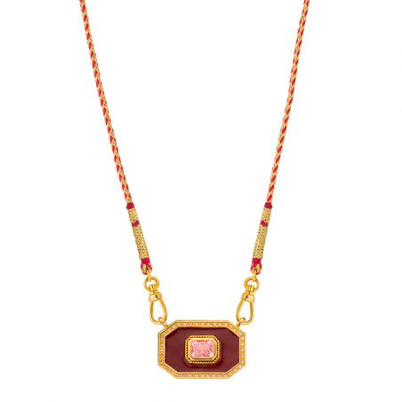 Mya Bay 's Burgundy Yucatan necklace captivates with its bold and refined style. Its red and gold braided cord chain showcases a geometric octagonal pendant, enhanced with a central burgundy stone with intense reflections. This stone is delicately set and surrounded by sparkling cubic zirconia, for a sophisticated and elegant sparkle.