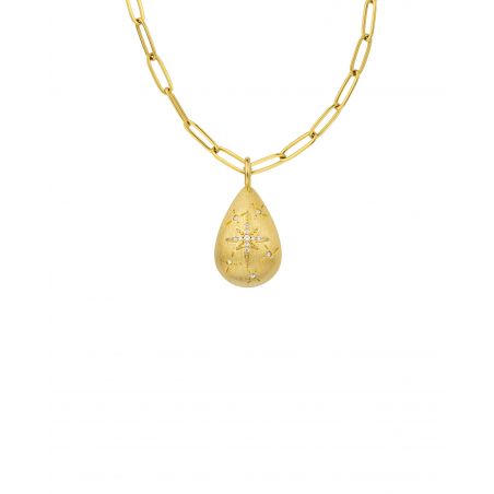 Its brushed gold-finished pendant reveals an elegant matte texture, delicately contrasted by the Diwali symbol pavé-set with sparkling zircons at its center. Subtle bursts of light set around the motif enhance the celestial and precious effect of the design.