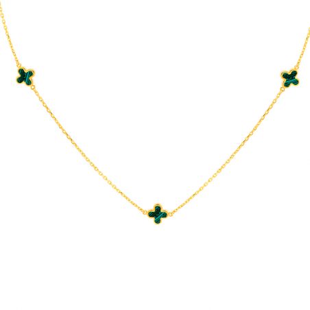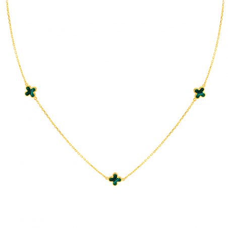 This 9 carat yellow gold cleef clover necklace is a women's necklace featuring 3 clovers measuring 6.5mm in diameter and covered with malachite .