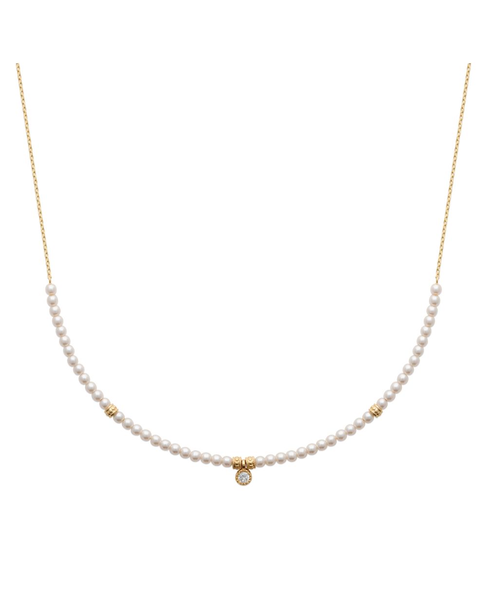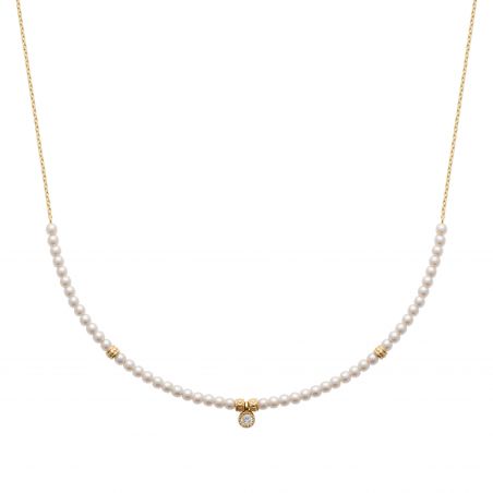 This necklace is an 18k gold plated necklace adjustable in length. This necklace is made of pearls and a round zirconium oxide pendant.